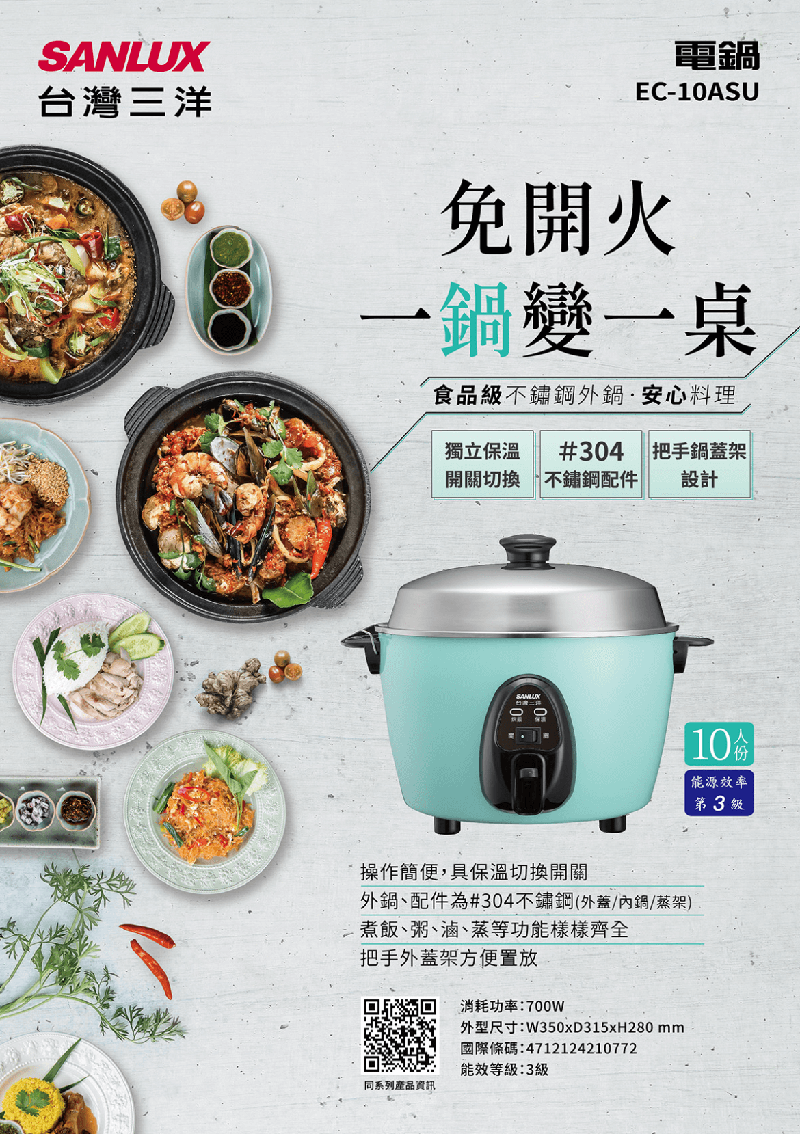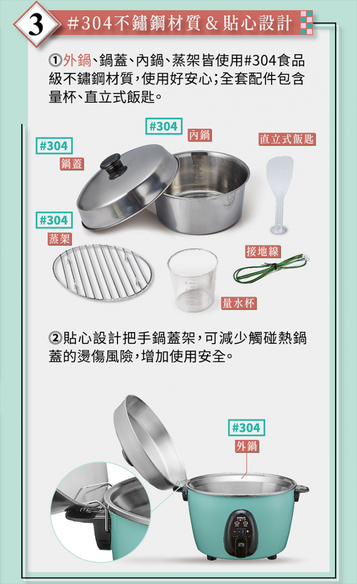 ‧ 配件為#304不鏽鋼(外鍋/外蓋/內鍋/蒸架)