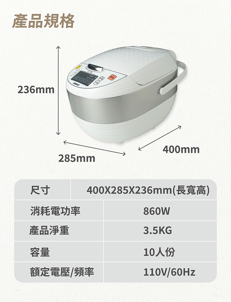 ‧ 配件:內鍋、蒸籠、飯匙、量杯、湯匙