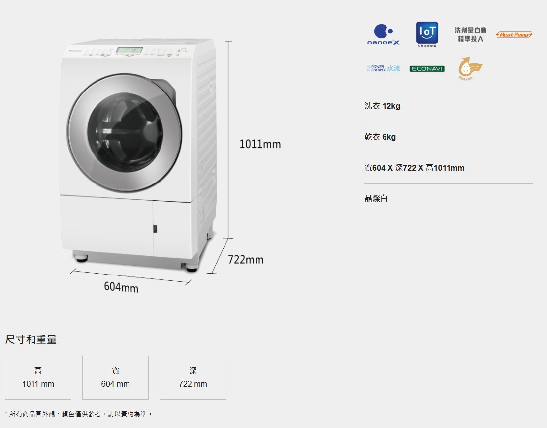 外觀尺寸 (寬x深x高) mm (不含給、排水管) 604x722x1011