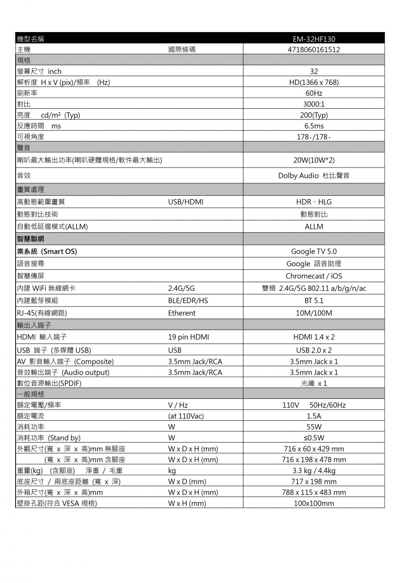 聲寶 |32吋聯網智慧顯示器EM-32HF130 (含運送+桌上型安裝+舊機回收 *樓層費另計)