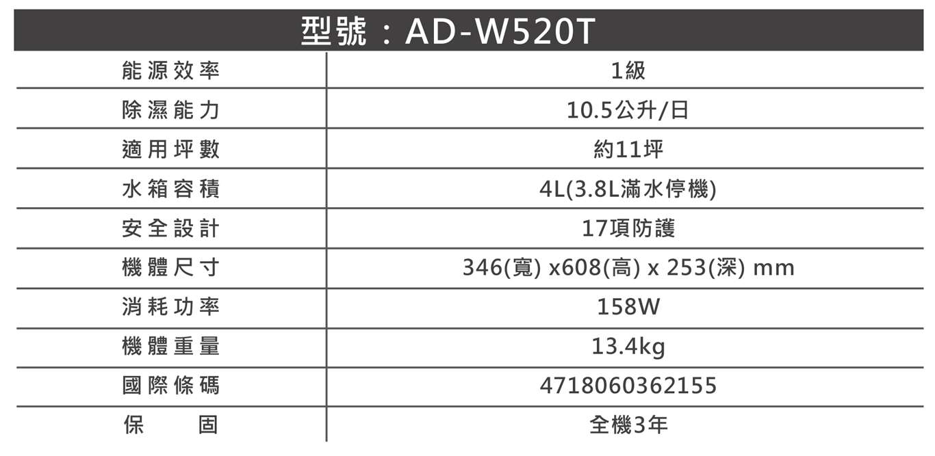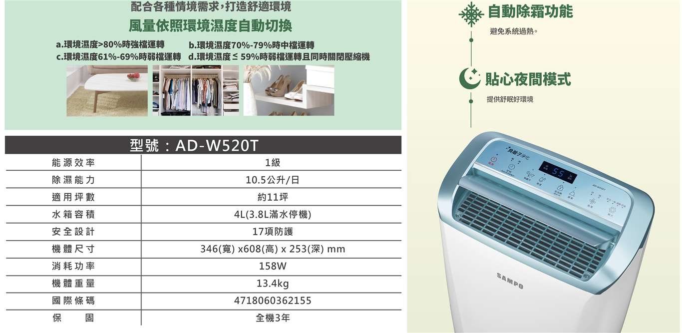 聲寶SAMPO|10.5L一級能效智慧全能除濕機AD-W520T