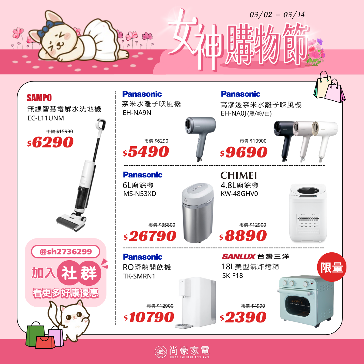 ▍ 寵愛自己趁現在 從地板清潔神器到沙龍級美髮好物 我們精選多款熱銷商品,限時推出超心動折扣! 給自己一個升級生活的理由,您值得最好的 限時促銷折扣~寵愛自己趁現在! 想要看更多隱藏版家電優惠? 手刀加入社群一起 +1 搶好康 尚豪家電 官方LINE:@sh2736299