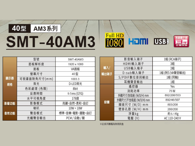 外觀尺寸(W/D/H)(不含底座) mm|892/46/507