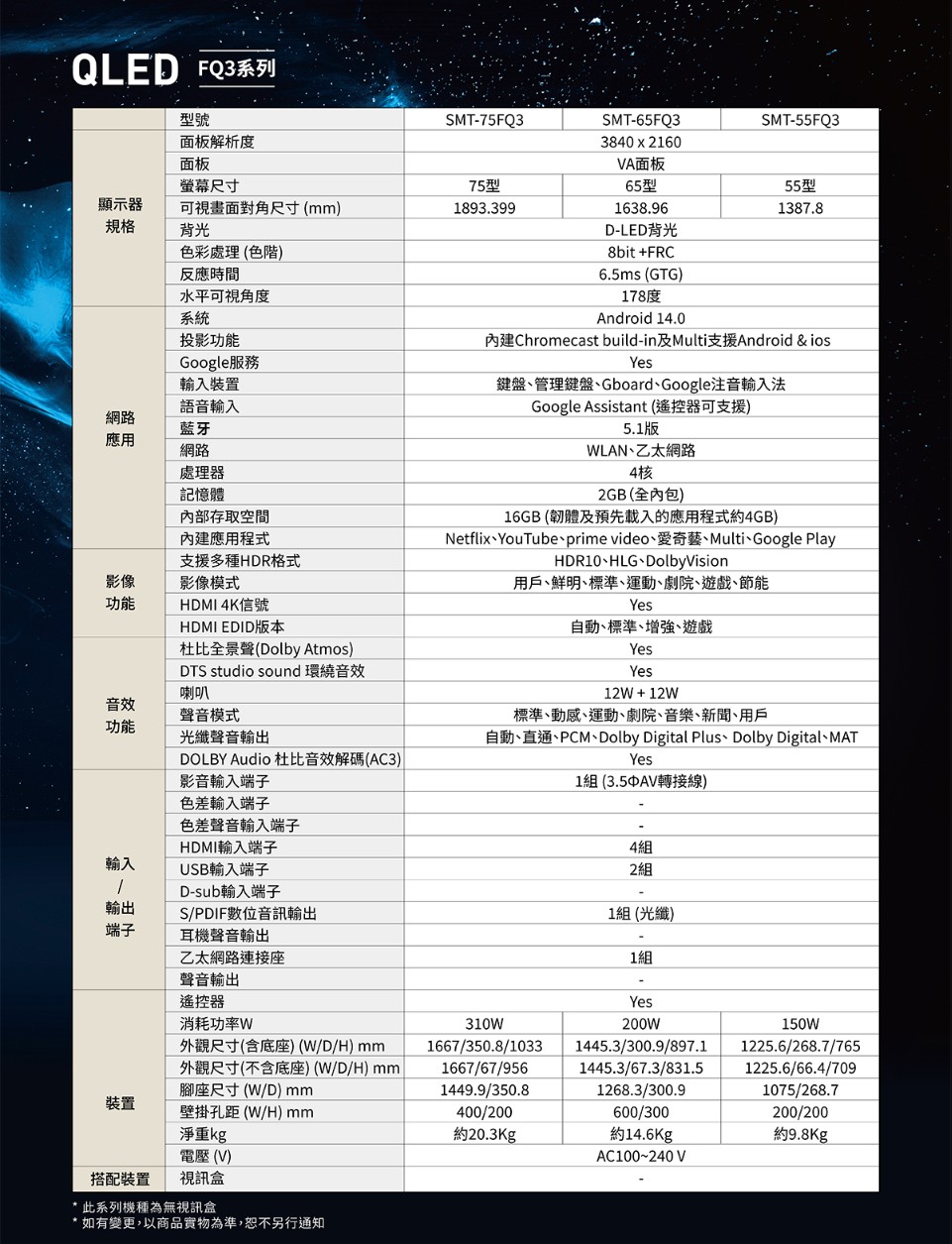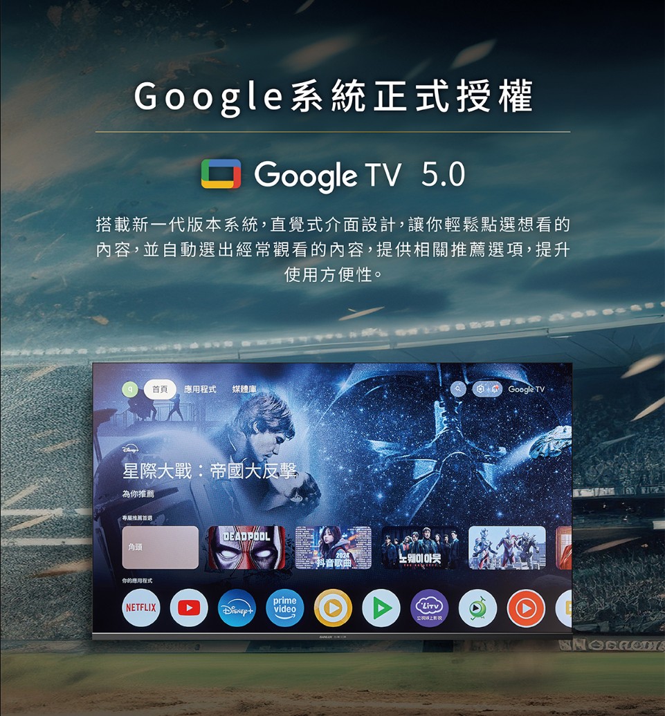 | 內建應用程式 | Netflix、YouTube、prime video、愛奇藝、Multi、Google Play | |