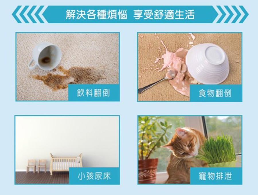 ◆ 輕鬆解決生活煩惱,掃除飲料或食物翻倒、小孩尿床、寵物排泄之汙漬