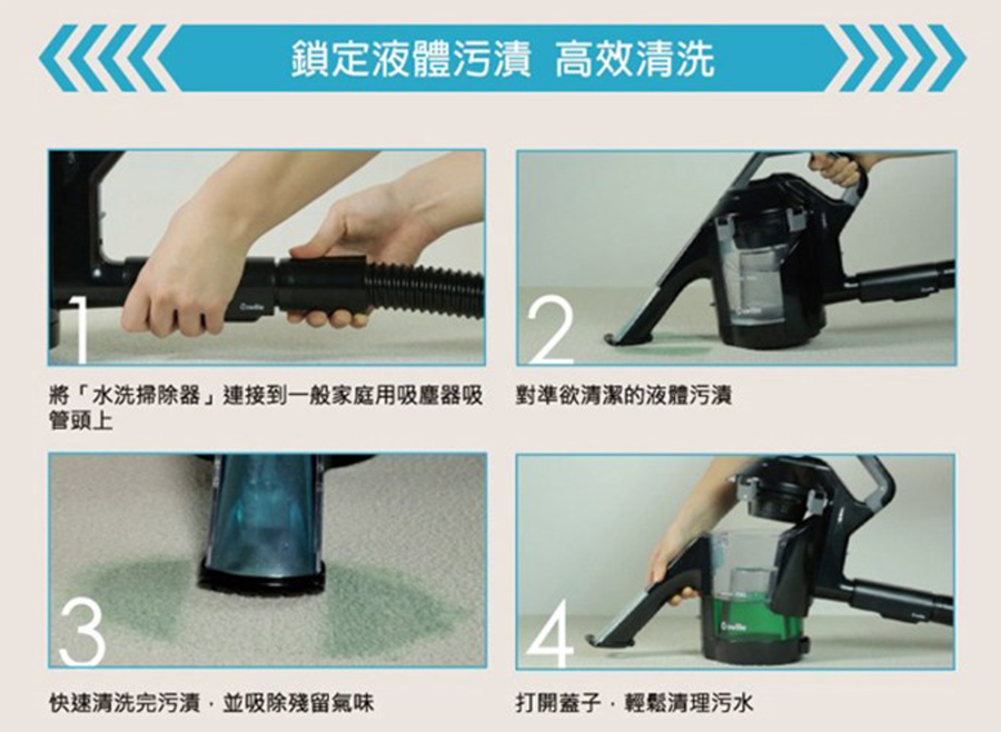 ◆ 專利濕式吸收技術:噴出清水洗淨髒汙,迅速吸回汙水及濕氣