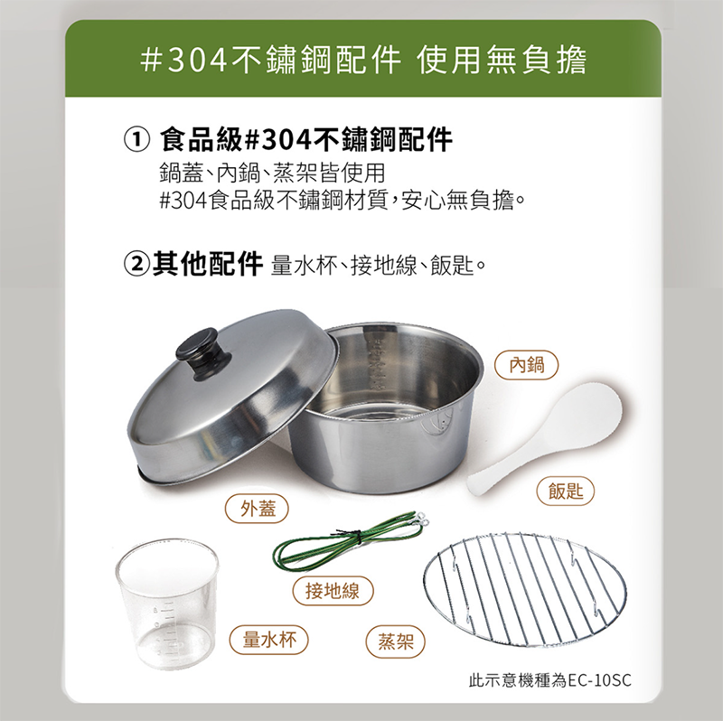 ‧ 配件為#304不鏽鋼(外蓋/內鍋/蒸架)