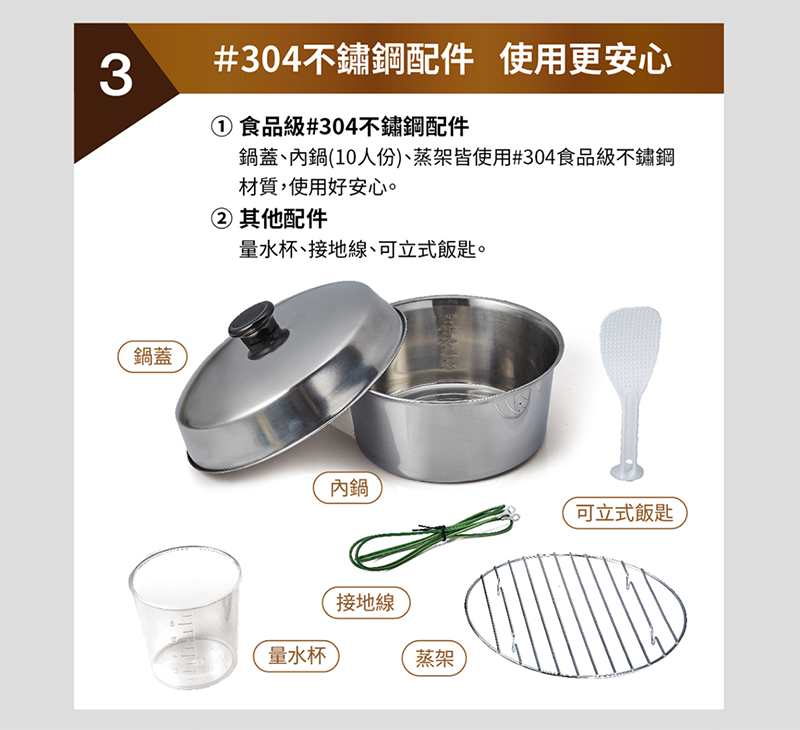 ‧ 配件為#304不鏽鋼(外蓋/內鍋/蒸架)
