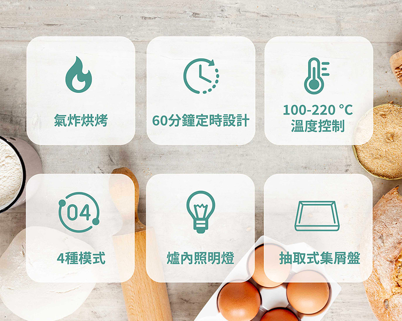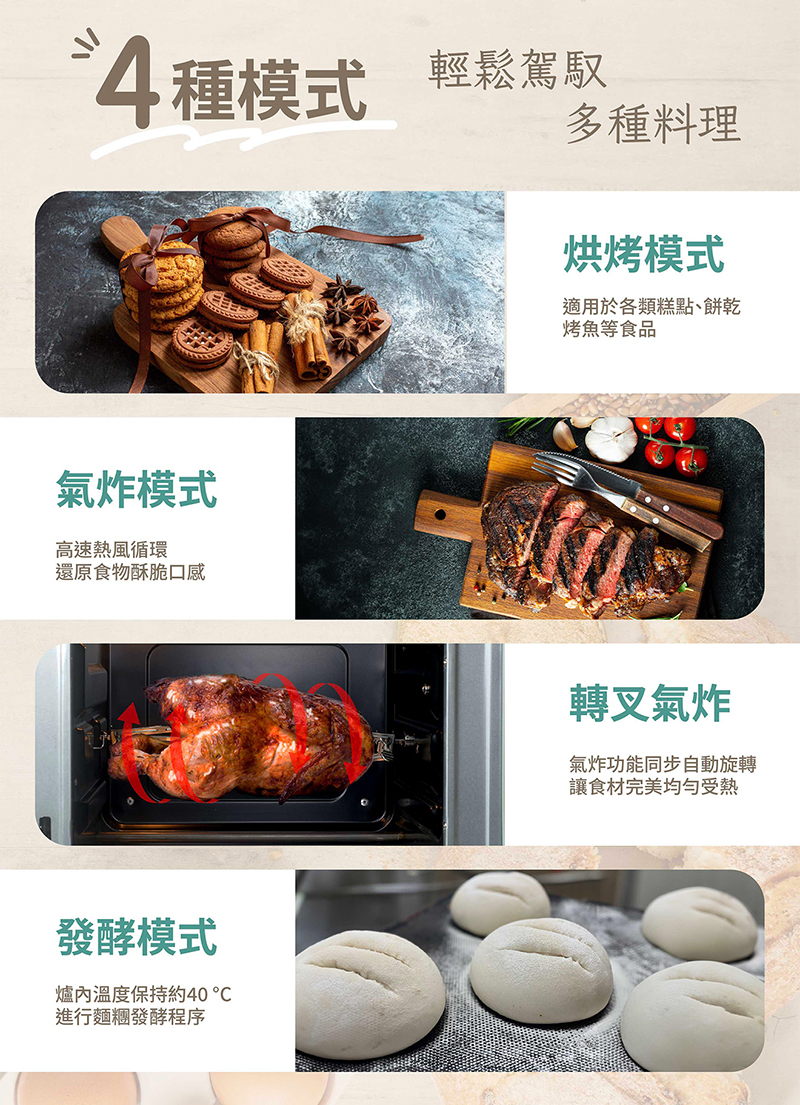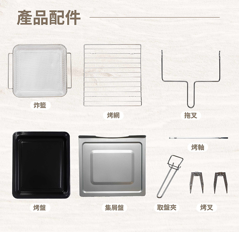 ‧ 配件:烤盤、烤網、炸籃、集屑盤、取盤夾、轉叉、托叉等。