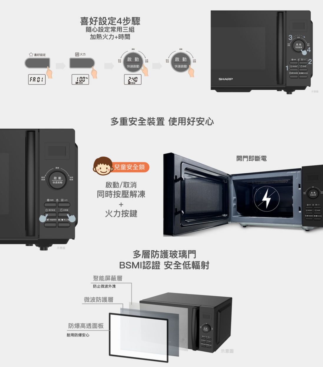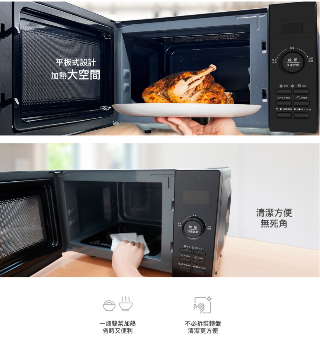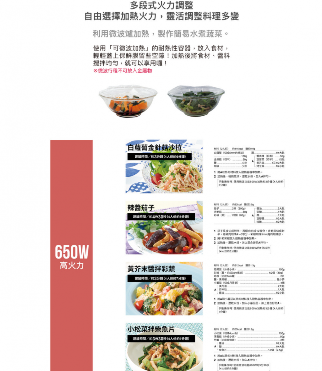 | 多段烹調 | 可兩段式烹調,設定第一段瓦數/時間+第二段瓦數/時間, 第一段烹調結束後會進行第二段設定烹調 |