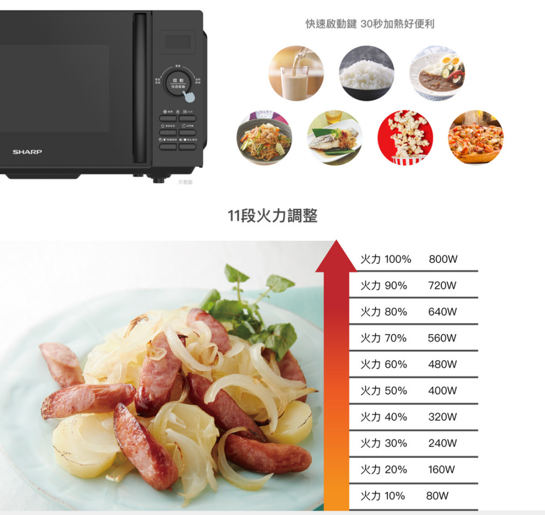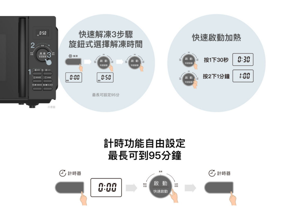| 快速啟動 | 按 [啟動‧快速啟動] 鍵 : 800W 30秒,每次按下可增加30秒,最長為10分鐘 |
