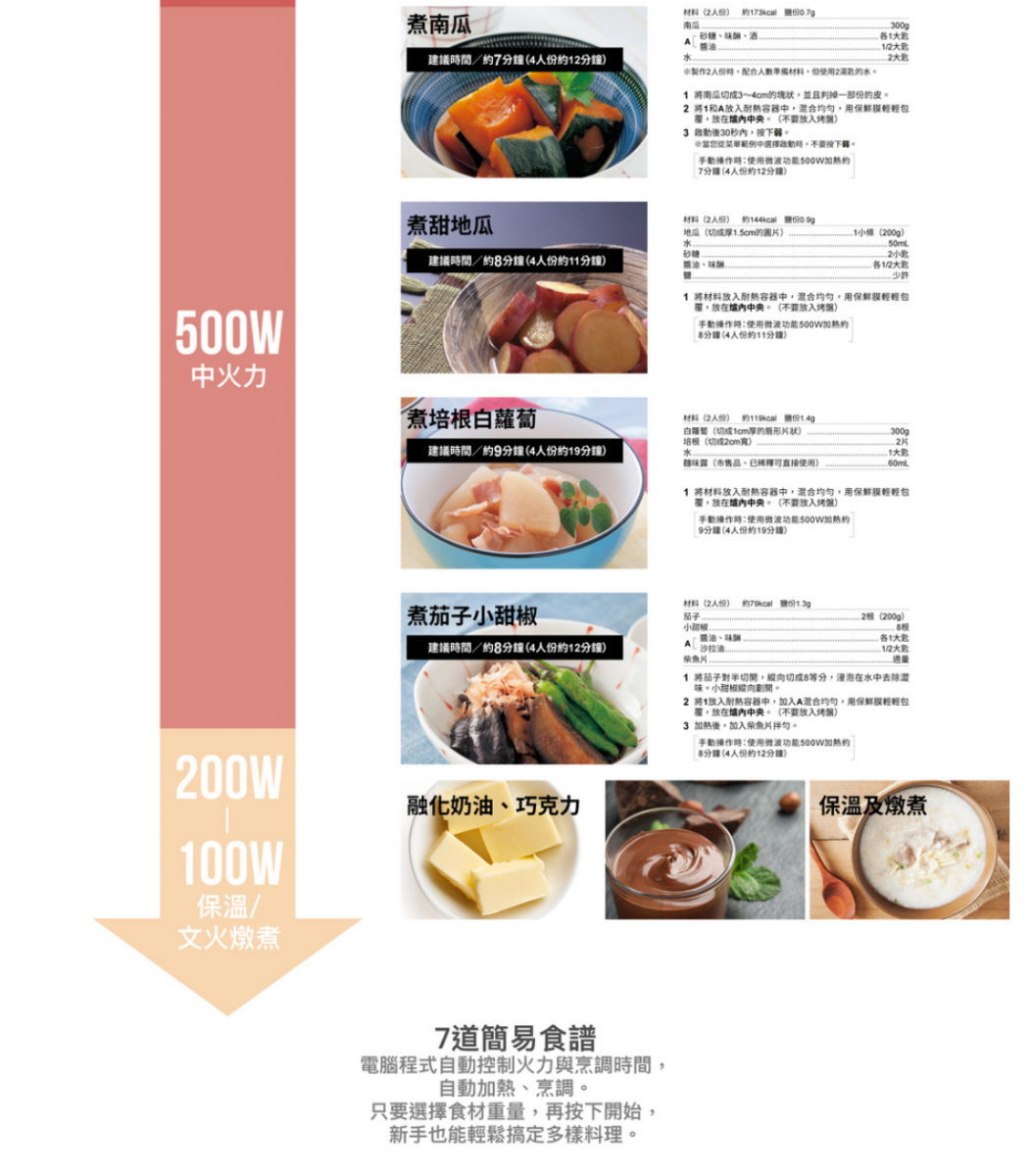 | 自動烹調 | 7種:爆米花、牛奶/咖啡、白飯、義大利麵、馬鈴薯、熱菜、魚 |