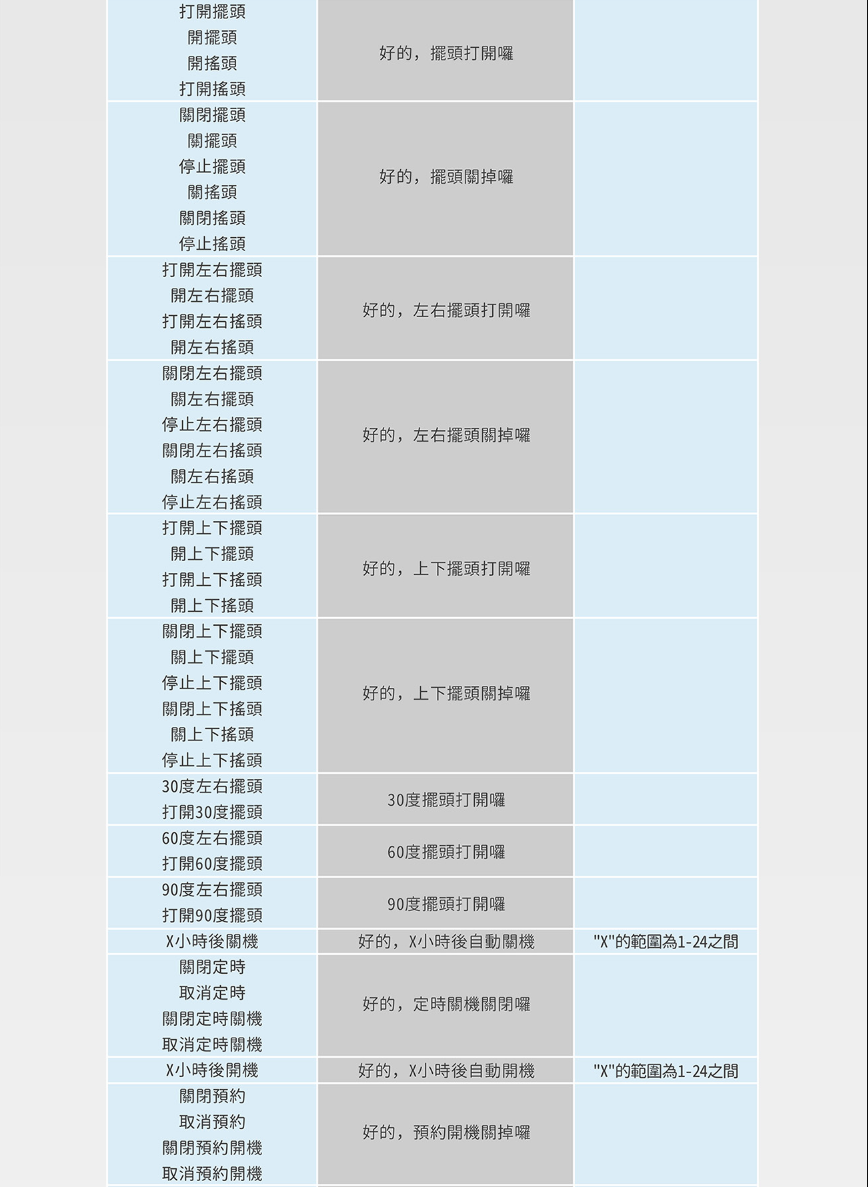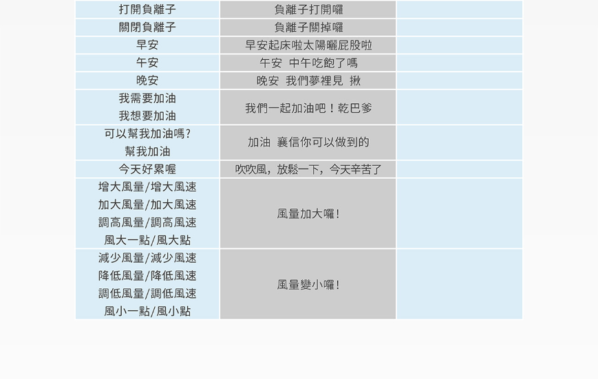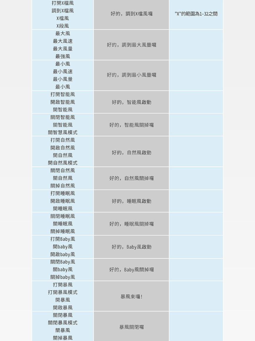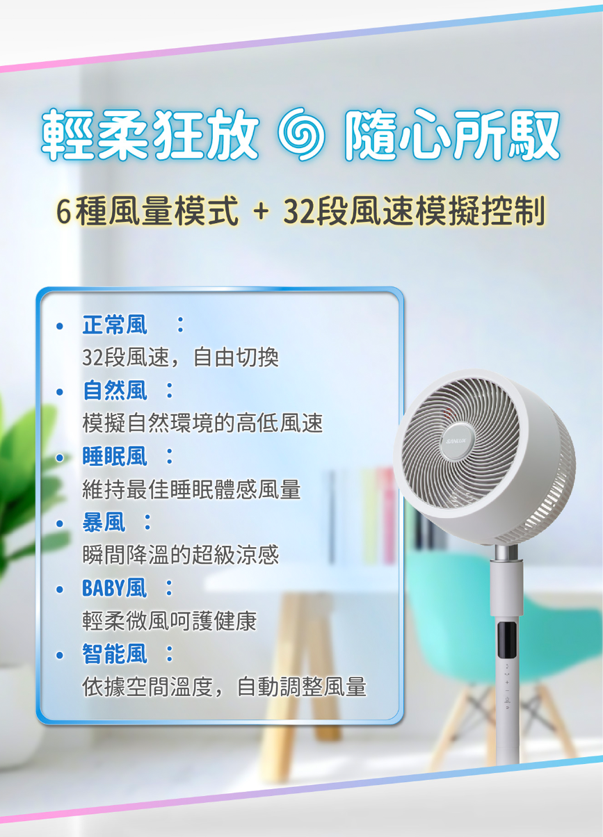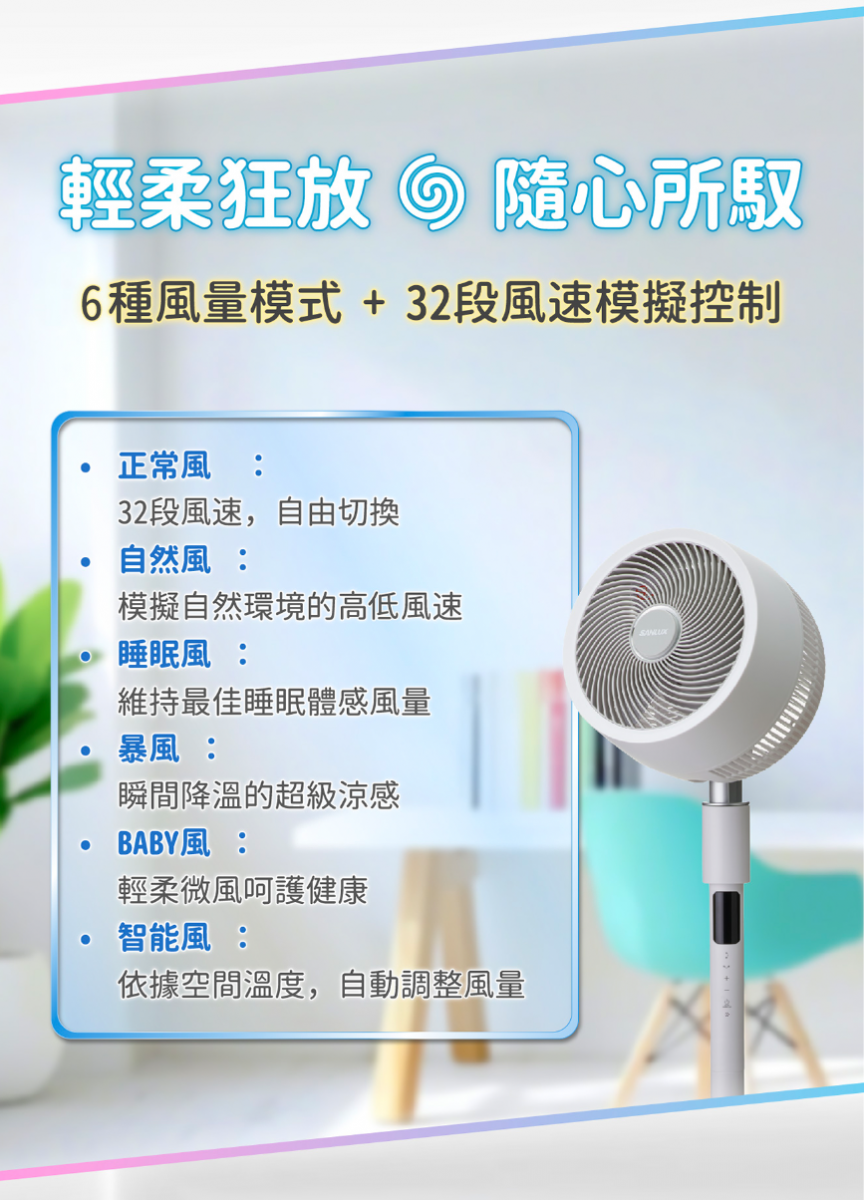 4. 自然風、智能風、睡眠風、暴風、baby風、一般風 等6種風力模式