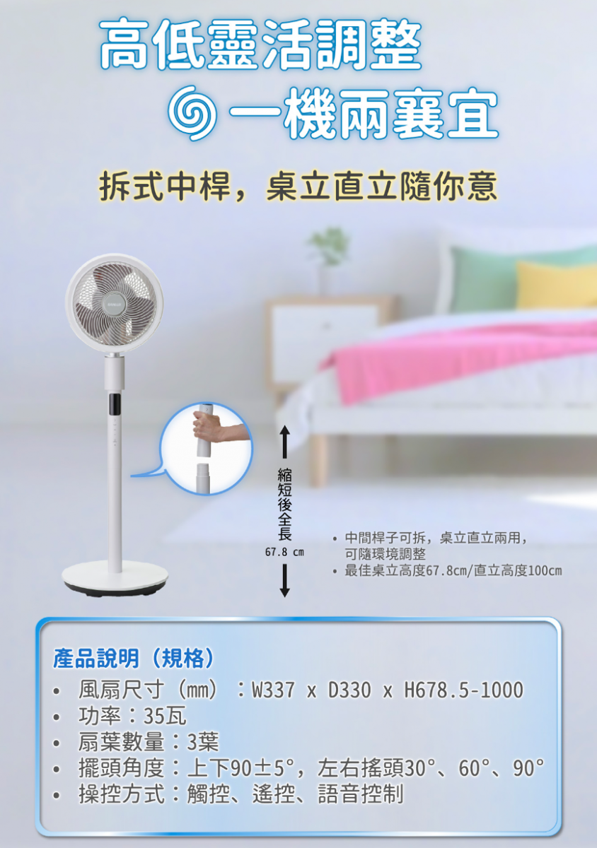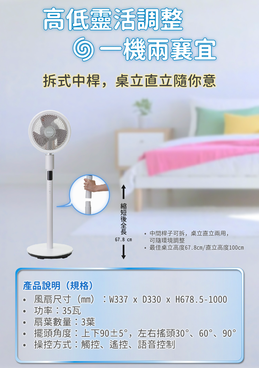 8. 三種操作模式,語音、觸控、遙控,附遙控器+遙控器收納座