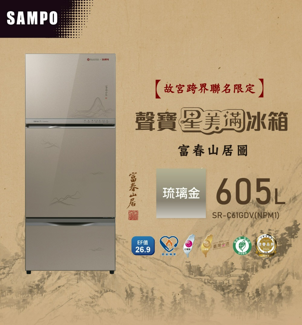 聲寶SAMPO|故宮聯名款〈富春山居圖〉605L三門玻璃變頻冰箱SR-C61GDV(NPM1)(含運送+拆箱定位+舊機回收 *樓層費另計)