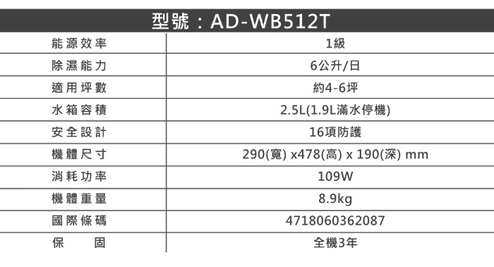聲寶SAMPO|6L一級能效除濕機AD-WB512T